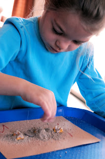 After reading, Pilgrim Cat, one of the boys favorite Thanksgiving related books, we did some corn planting of our own, Squanto style.  A few goldfish, popcorn kernals, sand and globs of glue later, they proudly showed off their neat rows of newly planted corn!
